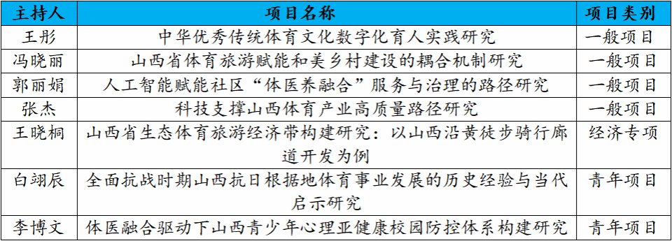 12月8日,山西省委宣传部公示了2025年度山西省哲学社会科学规划课题拟立项名单,我院教师在本次申报中取得优异成绩,其中一般类别课题3项,青年课题1项。本年度我院教师还分别获批了山西省哲社经济类专项课题1项、青年课题1项,以及山西省科技战略课题1项。我院在省部级项目立项数量再创新高,彰显出我院在体育哲学社会科学研究的深厚实力与创新活力。